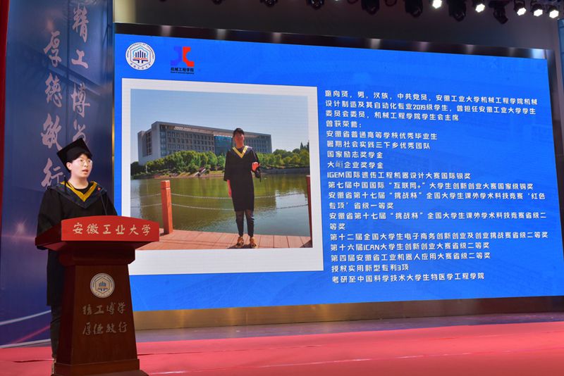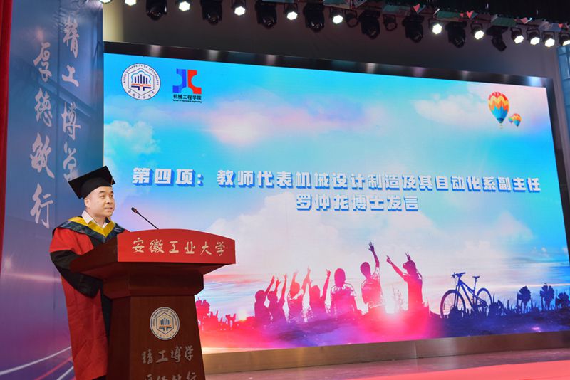 教师代表罗仲龙向毕业生们送上了“学会内省,持续学习”、“学会勇气,敢于践行”、“学会选择,懂得责任”的临别赠言;家长代表樊勇表达了对公司的由衷感激和美好祝愿;研究生毕业生代表应万明深情感怀“幸入工大,幸得良师,幸遇良友”的九年在校时光;本科生毕业生代表童向贤回顾了大学的难忘点滴,表达了对母校的感恩之情。