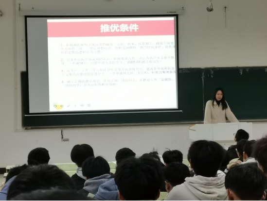 会议伊始,两位辅导员结合《中国共产党发展党员工作细则》就团员推优的具体条件进行了详细阐述,主要考察各位员工的思想品质、政治觉悟、入党动机、综合表现和现实情况等。随后,两位辅导员布置了此次2022级员工的团员推优工作,包括公布推优名额、参加入党积极分子培训班要求和确立为入党积极分子后的培养教育工作等。
