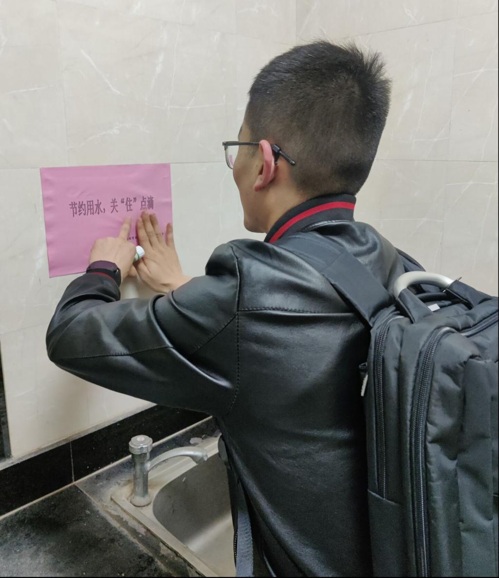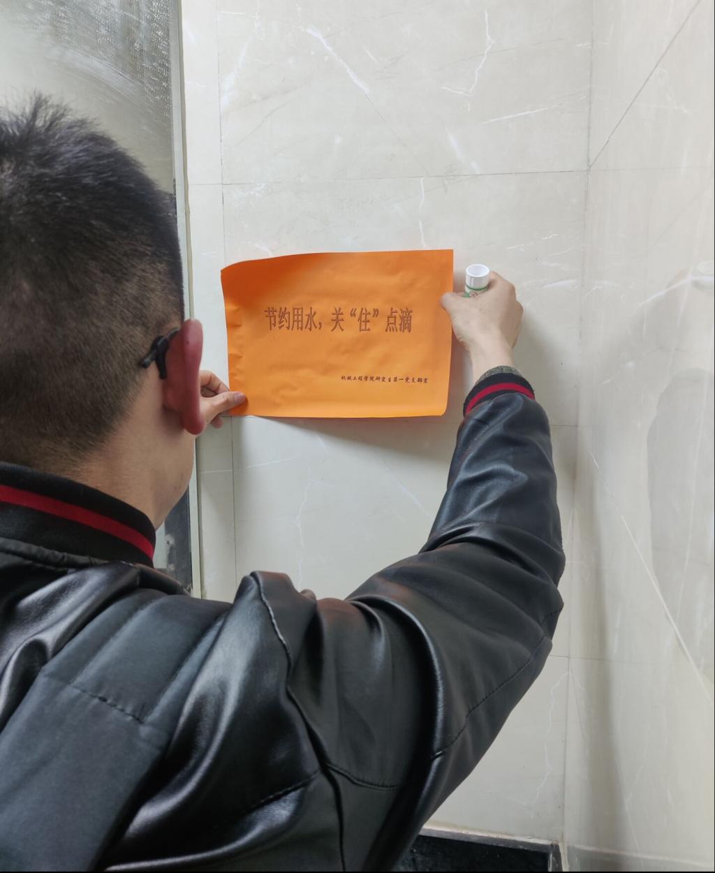 线下,研究生党员代表分别在机械楼的茶水间、卫生间的醒目位置张贴了精心制作的节约用水宣传标语。(撰稿:张敏 审核:李克明)