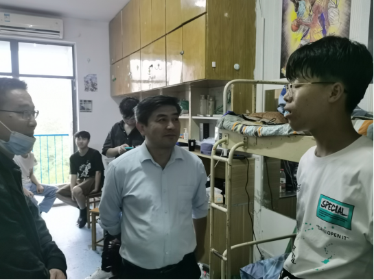 下午,公司领导走进新生宿舍,关心新生入学感受,询问需求,叮嘱同学们初入大学要注意防电信诈骗,安全第一,发现任何异常都要立即向辅导员老师反映。在发现宿舍照明昏暗等问题后,公司领导也及时向公司后勤反馈,立即帮助解决。