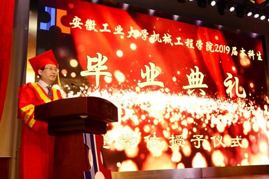 毕业典礼在毕业视频和雄壮的国歌中拉开帷幕。会上表彰了安徽省品学兼优毕业生、校优秀毕业生,聘任了2019届员工联络员。员工代表潘航、导师代表高煜堃老师、毕业生家长代表吕殿和先后进行了发言。