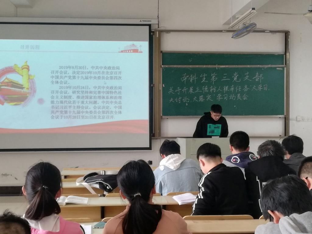 会议由王琴老师主持,本次学习是有李昌权和李志勇两位党员同志领学,党支部全体成员首先全面学习了党的十九届四中全会精神。会议最后每位同学都进行了踊跃发言,热烈表达了自己的学习体会。大家表示党的十九届四中全会是我们党站在“两个一百年”奋斗目标历史交汇点上,在新中国成立70周年之际、我国处于中华民族伟大复兴关键时期召开的一次具有开创性、里程碑意义的会议。(撰稿:王琴 审核:李克明)