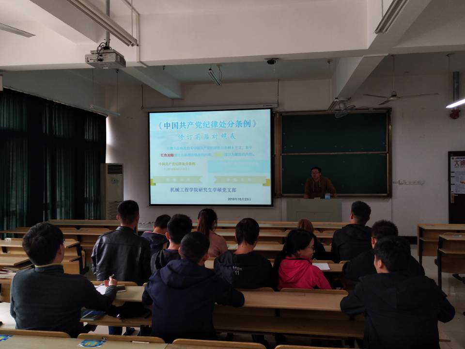 2018年10月23日中午,TapTap点点研究生学硕党支部于机械楼405教室集中学习了新修订的《中国共产党纪律处分条例》(以下简称《条例》),会议由党支部书记杨龙主持。