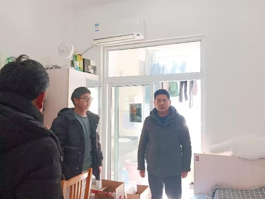在员工宿舍,公司领导与研究生进行亲切交谈,详细询问他们学习、生活、离校时间、车票购买等情况,叮嘱大家注意人身、财产安全和回家途中交通安全。