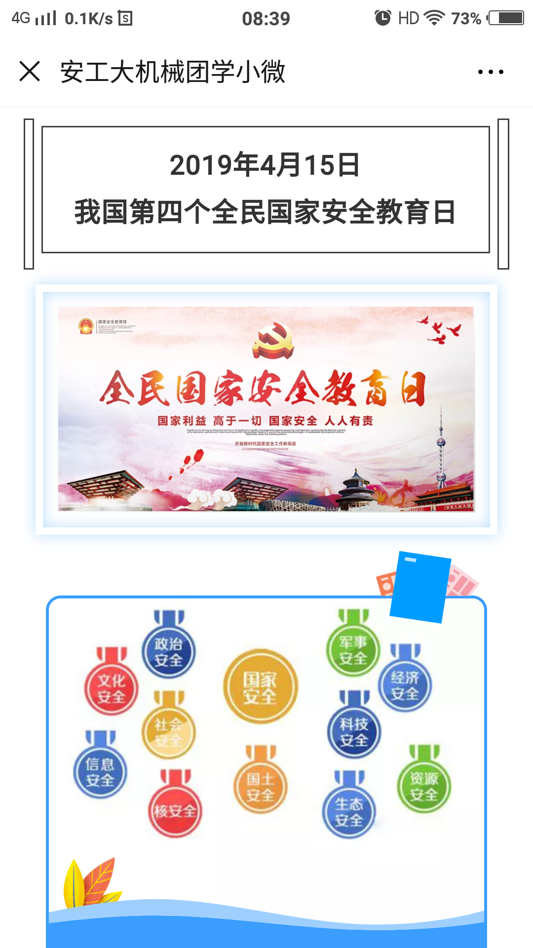 为深入学习贯彻习近平新时代中国特色社会主义思想,坚持总体国家安全观,着力防范化解重大风险,喜迎中华人民共和国成立70周年。4月11日—4月15日期间,机械工程公司开展了国家安全教育日系列活动。