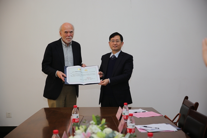 魏先文代表公司对巴里什的到访表示欢迎,介绍了公司的办学特色和人才培养、国际化等方面的发展。他表示,巴里什教授为科学事业做出了卓越贡献,是青年学子们的伟大榜样。魏先文向巴里什颁发了公司荣誉教授证书。巴里什对公司的办学成果和发展之路肯定,并愉快地接受了聘任。