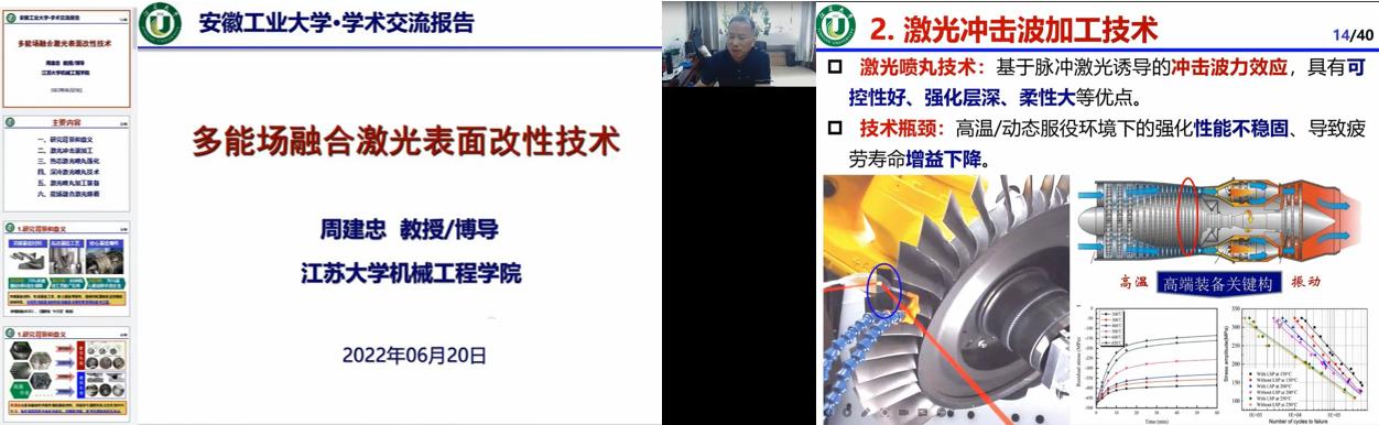 周建忠教授从高强合金构件在热力交变载荷作用下易产生疲劳失效的不足出发,引出以激光喷丸强化、激光熔覆涂层为代表的一系列表面改性技术。主要介绍了基于激光热、力效应的表面改性强化机理,分析了单一激光能场下改性组织和性能存在的不足,提出了温度场、电磁场、超声场融合激光表面改性工艺方法。重点介绍了热态激光喷丸(WLP)、深冷激光喷丸(CLP)、超声/电磁场协同激光熔覆(UELC)等多能场强化理论、数字化分析技术、工艺和组织性能以及技术装备研制等方面的最新进展,最后展望了多能场融合激光表面改性技术应用及前景。报告结束后,周教授与师生积极互动,对师生提出的问题进行详细的解读,报告激发了师生的科研热情,开拓与会师生的视野。