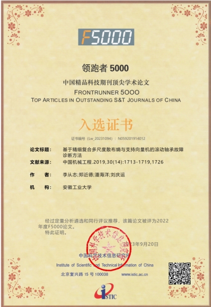 近日,据中国科学技术信息研究所发布,公司TapTap点点郑近德教授团队2019年发表在《中国机械工程》题为“基于精细复合多尺度散布熵与支持向量机的滚动轴承故障诊断方法”的论文入选2022年度“领跑者5000-中国精品科技期刊顶尖学术论文”。论文第一作者为硕士研究生李从志,通讯作者为郑近德教授。论文自发表以来,累计被引用97次,知网下载量1580次。