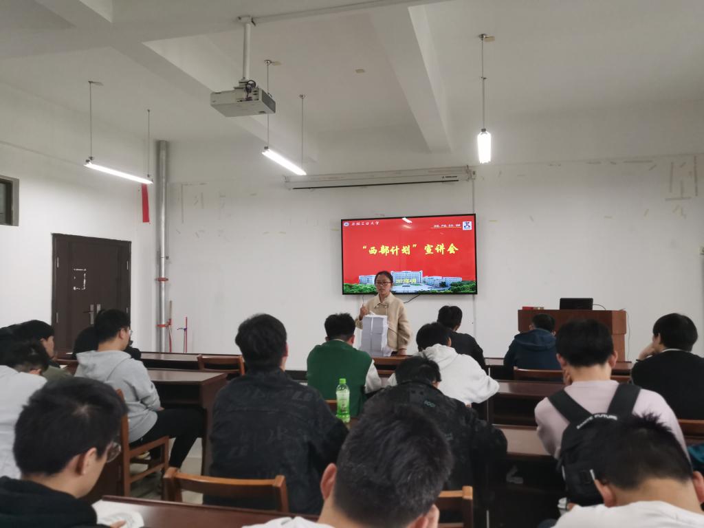 张敏从实施规模、服务内容、地方项目、报名条件等方面介绍西部计划的基本情况,从报名步骤、审核手续、招募流程、身体要求等方面介绍西部计划的报名流程,从岗位选择、服务待遇、服务年限、手续办理、身份证明等方面介绍西部计划的服务情况,从培训时间、培训内容等方面介绍西部计划的培训情况,从就业政策、创业政策、考研政策、考公政策、工龄计算、学费与助学贷款代偿等方面介绍西部计划的政策保障。并以公司2022届成功参加西部计划的毕业生沈洋的优秀事迹为例,向同学们分享他的西部计划历程与心得体会。同时,通过定期转发微信推文、线下一对一答疑等方式,促进同学们了解西部计划的基本情况和相关政策,激励同学们厚植家国情怀,响应国家号召,奔赴祖国西部,将青春的汗水洒在祖国的西部大地上,让青春之花在祖国和人民最需要的地方绚丽绽放!(撰稿:张敏 审核:李克明)