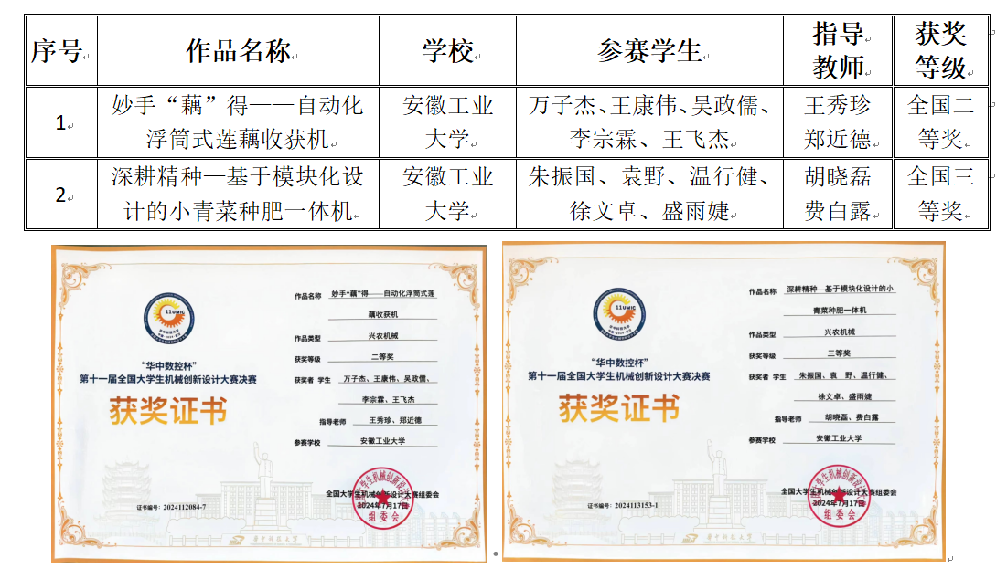 经过激烈角逐,公司万子杰等人的《妙手“藕”得——自动化浮筒式莲藕收获机》(指导教师:王秀珍、郑近德)荣获国赛二等奖,朱振国等人的《深耕精种-基于模块化设计的小青菜种肥一体机》(指导教师:胡晓磊、费白露)荣获国赛三等奖。此外,本次竞赛另有2件作品获得安徽省赛一等奖,4件作品获得安徽省赛二等奖,5件作品获得安徽省赛三等奖。