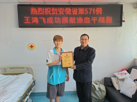 下午2点,历经4小时30分钟,王鸿飞同学成功捐献造血干细胞混悬液284毫升,成为公司第3位捐献造血干细胞的在校老员工、中华骨髓库安徽省第571例、也是马鞍山市最年轻的捐献者,他的造血干细胞将为一名重症患者带去生的希望,赵龙为其颁发了《捐献造血干细胞》荣誉证书。(撰稿:费白露 审核:濮莹萍 周环 陈庆林)